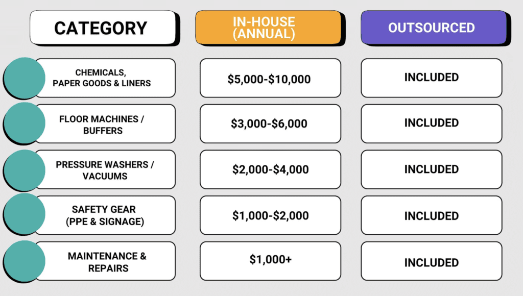A full-service commercial cleaning contract of similar scope typically costs $100,000–$130,000 per year, often 25–35% less than maintaining internal staff.